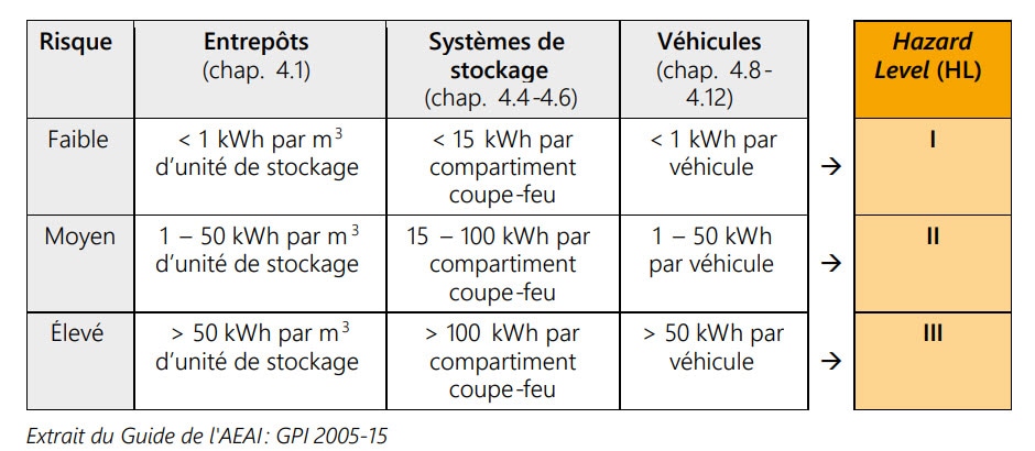 Comme vu précédemment, les batteries au lithium représentent un risque non négligeable et sont à considérer comme des matières dangereuses. Or, la Directive de Protection Incendie « DPI 11-15 » de l’AEAI classe le Degré d’Assurance Qualité (DAQ) d’un bâtiment selon la masse/quantité de matières dangereuses, ce qui n’est pas adapté pour les batteries au lithium pour lesquelles le risque est lié à la densité d’énergie présente plus qu’à leur poids.