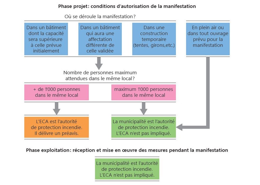 La commune est responsable d’intégrer l’ECA si la manifestation compte plus de 1000 personnes dans un local non prévu à cet effet. Dans ce cas, l’ECA délivrera un préavis dont la commune devra tenir compte pour délivrer l’autorisation; sinon la commune est responsable de se déterminer sur la protection incendie.