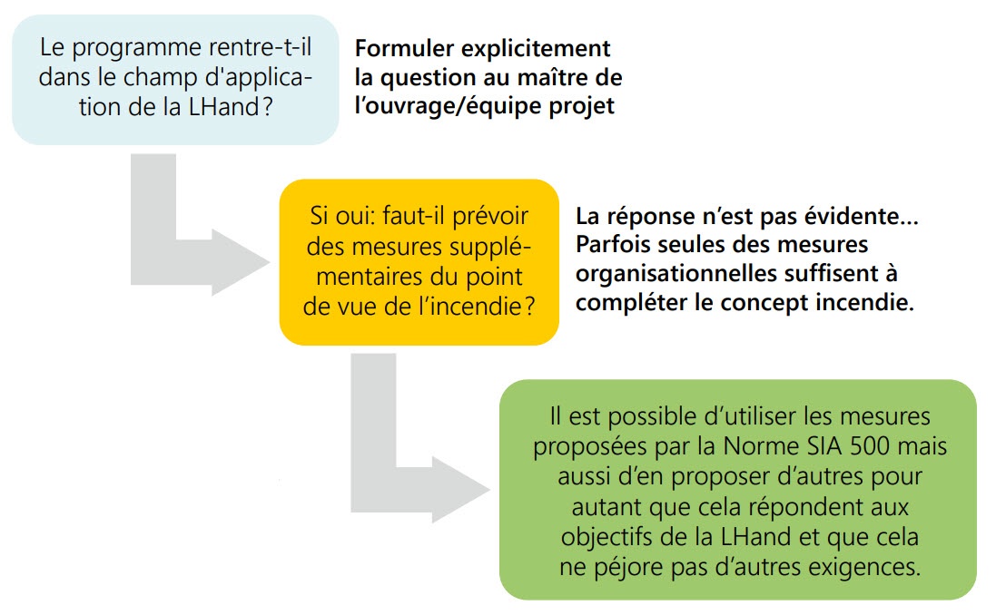 Le concept de protection incendie, élaboré en phase de projet, doit tenir compte des spécificités des personnes accueillies (clients et employés), en particulier de leur niveau d’autonomie et de la nature de leur handicap. En règle générale, la grande majorité des mesures exigibles dans le cadre d’un concept de protection incendie standard répondent aux besoins de la LHand. Cependant, dans certains cas, des mesures spécifiques et adaptées, identifiées par le Responsable de l’Assurance Qualité (RAQ) peuvent être prévues en supplément. Comme pour tous les dossiers évalués sur le plan de la protection incendie, les mesures proposées doivent être analysées sous le prisme de la proportionnalité.